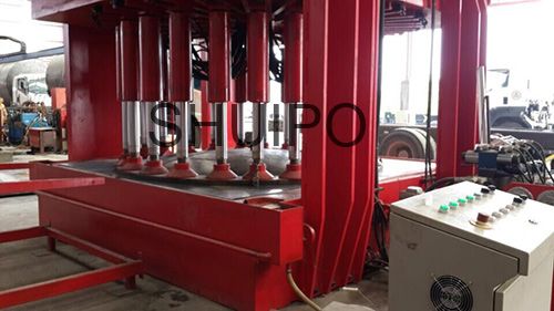 液壓缸采用倒吊的方式安裝在上平臺上,上平臺安裝導(dǎo)向條,液壓缸可在導(dǎo)向條內(nèi)自由移動,以適應(yīng)各種封頭的形狀。液壓系統(tǒng)應(yīng)用比較廣泛,其壓力大、可操作性好,配件比較容易采購。